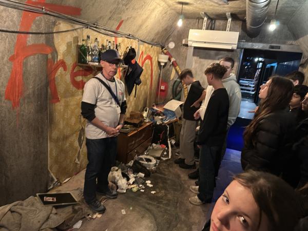 Es ist harte Kost, die die Schüler der 8. und 9. Klasse der Mittelschule Niederviehbach serviert bekommen. I In dem Zug ist unter anderem die völlig versiffte Wohnung des Drogentoten nachgebildet. Im letzten Waggon dann ist die Stelle original nachgebildet, an der Pavels Freund an einer Überdosis gestorben ist. Ein trostloser Betonboden, mit Kreide sind die Umrisse des Drogentoten aufgemalt.